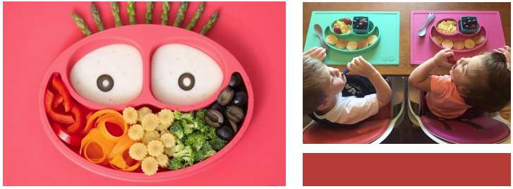 The ezpz happy mat comes in various cheerful colors and has a cute friendly face that helps separate the food for the child.